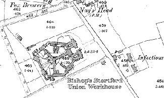 The Bishop's Stortford Union Workhouse came into being in 1837 when, under the 1834 Poor Law Acts, parishes were required to combine to operate purpose-built workhouses. Under previous arrangements individual parishes were responsible for employing and maintaining the poor of their own parish. In 1835 a Board of Guardians met in the George Hotel, North Street, Bishop's Stortford and purchased four acres in Haymeads Lane. By 1900 the area that was used for accommodation, workshops, gardens and infirmaries amounted to over seventeen acres. The Bishop's Stortford Union comprised ten Hertfordshire parishes and ten from neighbouring Essex.